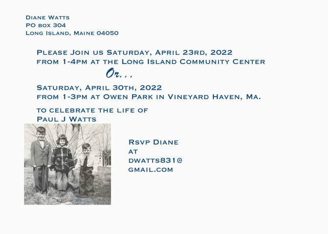 His life may have been cut short, but he lived it to the fullest. His life may have been cut short, but he lived it to the fullest. A Celebration of Life will be held on Saturday, April 23, 2022, from 1-4PM at the Long Island Community Center, or on Saturday, April 30, 2022 from 1-3PM at the Owen Park, Vineyard Haven, MA, because Paul lived for entertaining and mustn't be limited to just one celebration! Please RSCP to Diane at DWATTS831@gmail.com